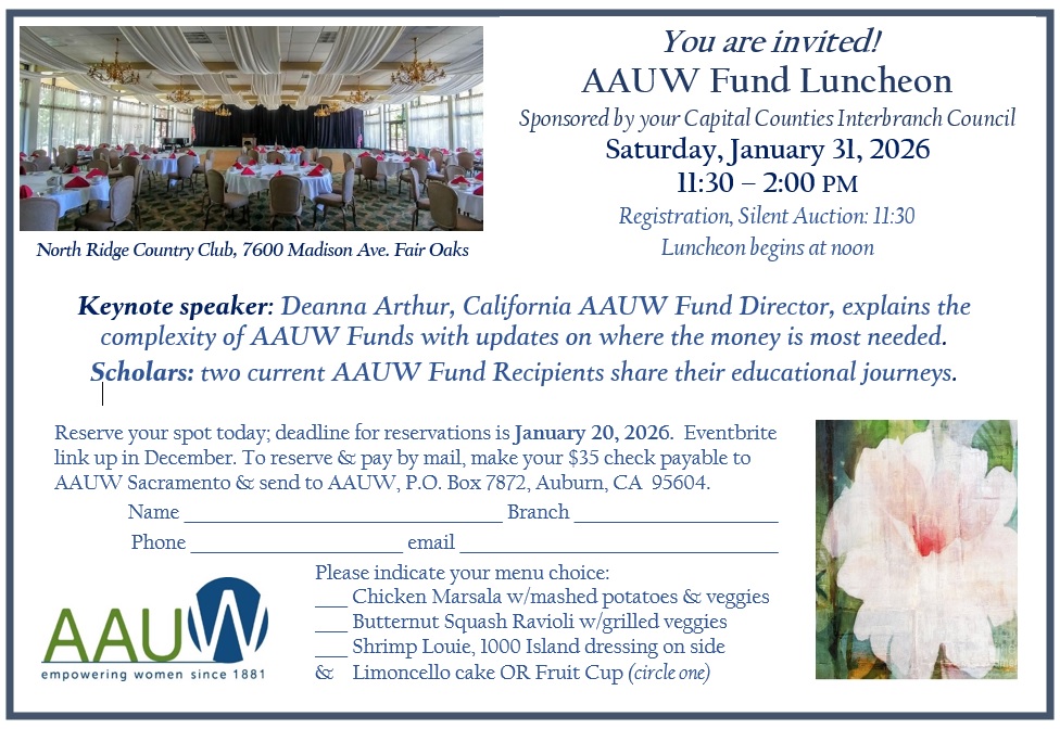 To reserve and pay by mail, make your $35 check payable to AAUW Sacramento and mail to AAUW, P.O. Box 7872, Auburn, CA 95604.