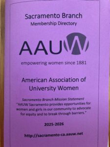 What was blue in 2021, bright pink in 2022, lime green in 2023, and lemon yellow in 2024? You got it! Our list of current members of AAUW Sacramento – our Membership Directory. Your 2025-26 directory, with its lovely purple cover, was mailed mid-September and should have reached you by now. PLEASE take a look at your entry and let Donna Holmes know of any updates. Her contact information is in the Membership Directory. THANKS!